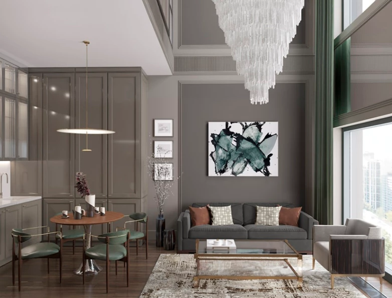 Дизайн апартаментов выполнен в современном и неоклассическом стилях, каждый из которых реализован в двух цветовых гаммах.